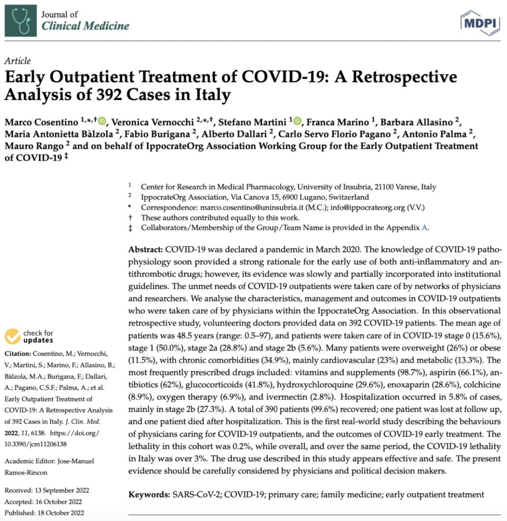 È stato pubblicato ieri sul Journal of Clinical Medicine (MDPI) lo studio che descrive l’esperienza di cura precoce domiciliare del COVID-19 da parte dei medici volontari nell’ambito della rete collaborativa di IppocrateOrg da novembre 2020 a marzo 2021. Lo studio include 392 pazienti curati da 10 medici ed è la più numerosa casistica italiana disponibile nella letteratura medica e scientifica.