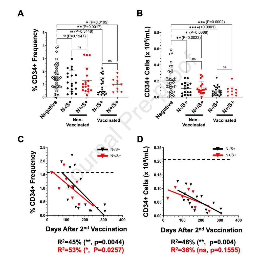 (i) il Covid e ancora di più il vaccino riducono le CD34+. Nel caso del vaccino, la riduzione è tanto più alta quanto più tempo è passato dalla seconda dose;