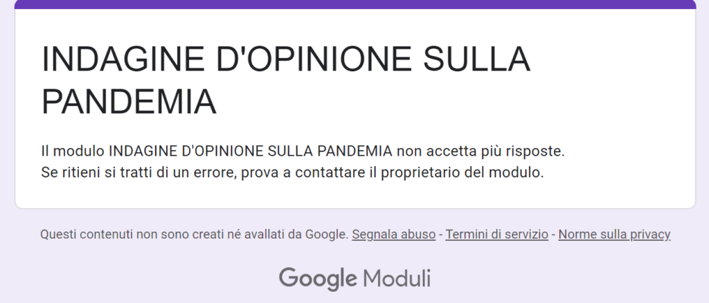 E’ stato predisposto un questionario in lingua italiana analogo a quello utilizzato da Rasmussen Reports. A differenza di costoro, che hanno rilevato le opinioni in funzione dell’orientamento politico dei partecipanti, in questo studio sono state aggiunte due domande facoltative volte a rilevare l’eventuale pregresso COVID-19 e la condizione vaccinale. Il questionario completo nella forma in cui è stato proposto è disponibile in rete (https://forms.gle/w8ep5mMesyUdAgaM9). Il questionario è stato sviluppato sulla piattaforma Google Moduli. La compilazione richiedeva l’accesso a Google per limitare la possibilità che una stessa persona compilasse più volte in questionario. Il questionario è stato diffuso e pubblicizzato tramite il canale Telegram https://t.me/MarCosent. Il post Telegram è stato pubblicato in forma condivisibile ed è di conseguenza stato diffuso da un numero imprecisato di altri profili. Il questionario è rimasto aperto dalle 20:00 del 31 marzo 2023 alle 13 del 2 aprile 2023.