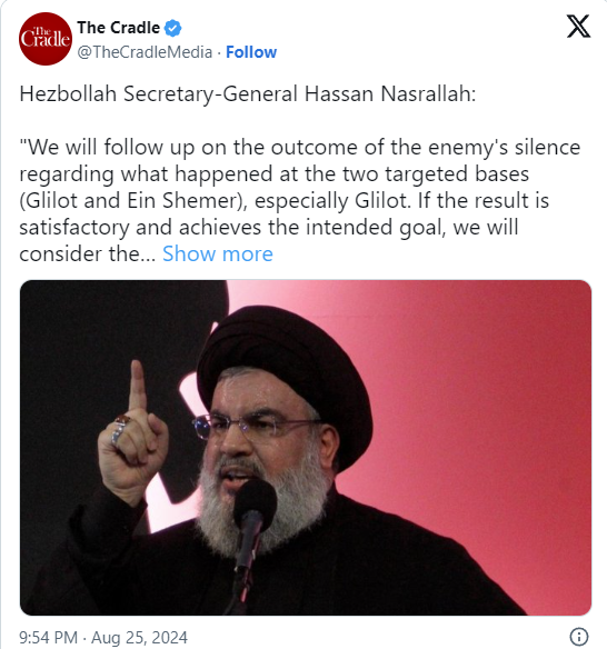 Il segretario generale di Hezbollah, Hassan Nasrallah, ha dichiarato il 25 agosto che la resistenza libanese “si riserva il diritto di rispondere” nuovamente contro Israele se i risultati dell’operazione di domenica si rivelassero “insoddisfacenti”. L’operazione Quarantaesimo Giorno, come l’ha soprannominata il gruppo della Resistenza, è stata “realizzata esattamente come era stata meticolosamente pianificata”, ha detto Nasrallah, aggiungendo che Hezbollah “darà seguito all’esito del silenzio del nemico riguardo a quanto accaduto nelle due basi prese di mira [Glilot ed Ein Shemer], in particolare Glilot”. “Se il risultato è soddisfacente e raggiunge l’obiettivo prefissato, considereremo la ritorsione completata. Se il risultato è insufficiente, ci riserviamo il diritto di rispondere fino a nuovo avviso”, ha aggiunto.