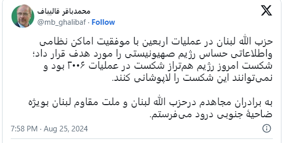La Jihad islamica palestinese (PIJ) ha affermato che l’operazione ha dimostrato “fermezza nelle sue posizioni e il mantenimento delle sue promesse”. “Questa risposta forte ed efficace nel profondo dell’entità occupante, che è ancora aperta, conferma che la resistenza è capace, forte e onesta nelle sue promesse e minacce”, ha affermato domenica il movimento di resistenza Ansarallah dello Yemen. Il presidente del parlamento iraniano Mohammad Bagher Qalibaf ha affermato che Hezbollah “è riuscito durante l’operazione … a colpire strutture militari e di intelligence sensibili dell’entità sionista”, rendendo omaggio alla resistenza libanese “il popolo resistente del Libano, specialmente nei sobborghi meridionali”.