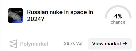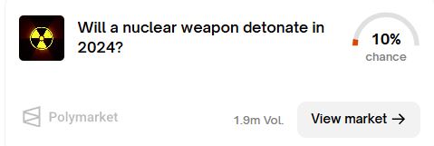 Gli utenti del sito web Polymarket, piattaforma di previsioni di mercato, hanno aumentato l’offerta del contratto “Un’arma nucleare esploderà nel 2024?” dall’11% alle 04:00 ET a circa il 18% alle 09:30 ET.