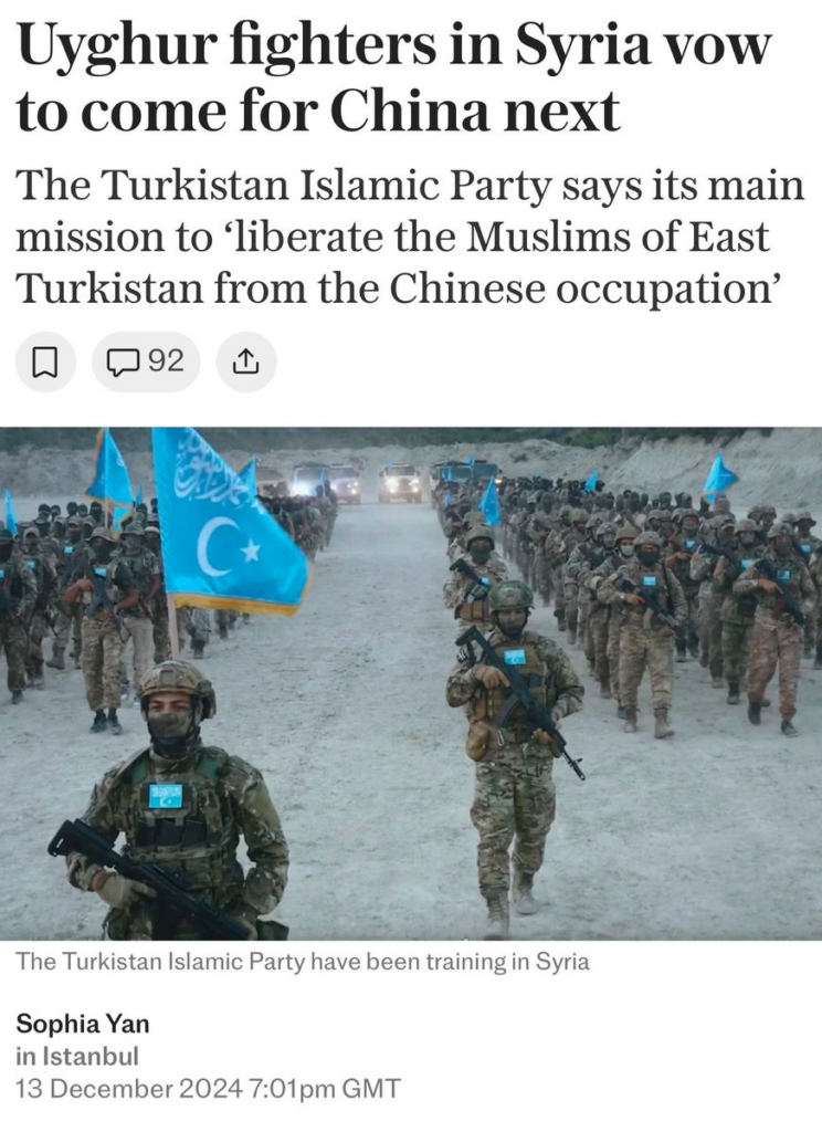 Il rapido crollo dell’esercito arabo siriano di fronte all’avanzata di Hayat Tahrir al-Sham, sostenuto dalla Turchia… ha attirato l’attenzione sui combattenti stranieri al suo interno. In primo luogo, tra questi combattenti stranieri ci sono gli uiguri della regione autonoma uigura dello Xinjiang in Cina. Combattevano la Cina come parte del Movimento islamico del Turkestan orientale, ma alcuni anni fa hanno cambiato nome in Partito islamico del Turkestan.