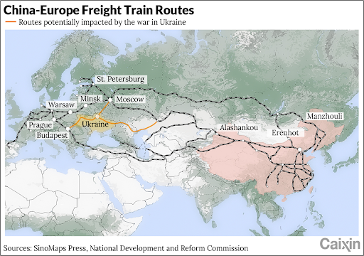 L’invasione dell’Ucraina da parte della Russia nel febbraio 2022 ha gettato una grande chiave inglese nella rete di trasporto merci eurasiatica abilitata dal CEFT… L’interruzione sembra importante poiché la guerra è il più grande conflitto europeo degli ultimi otto decenni, con gravi conseguenze geopolitiche… Potrebbero verificarsi alcune interruzioni… poiché le aziende europee evitano di utilizzare le ferrovie russe, temendo sanzioni economiche…