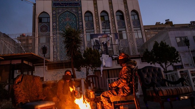 I ribelli islamici di Hayat Tahrir al-Sham accendono un fuoco per riscaldarsi mentre sorvegliano l’ambasciata iraniana abbandonata a Damasco, 13 dicembre 2024