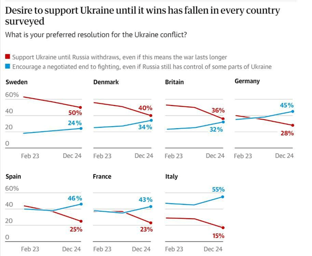 Infine, un nuovo sondaggio mostra che l’intera popolazione europea ha drasticamente cambiato il proprio appoggio a soluzioni massimaliste filo-ucraine, con la maggioranza che ora si sta spostando verso persone che vogliono la fine della guerra, anche se questo vuol dire perdite territoriali per l’Ucraina: