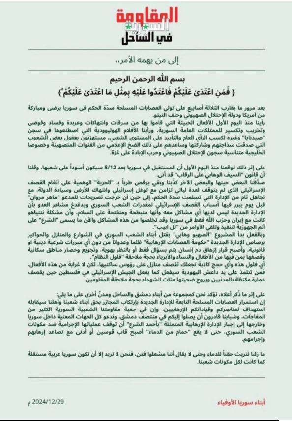 Prima dichiarazione della resistenza armata araba siriana, 29 dicembre 2024.
