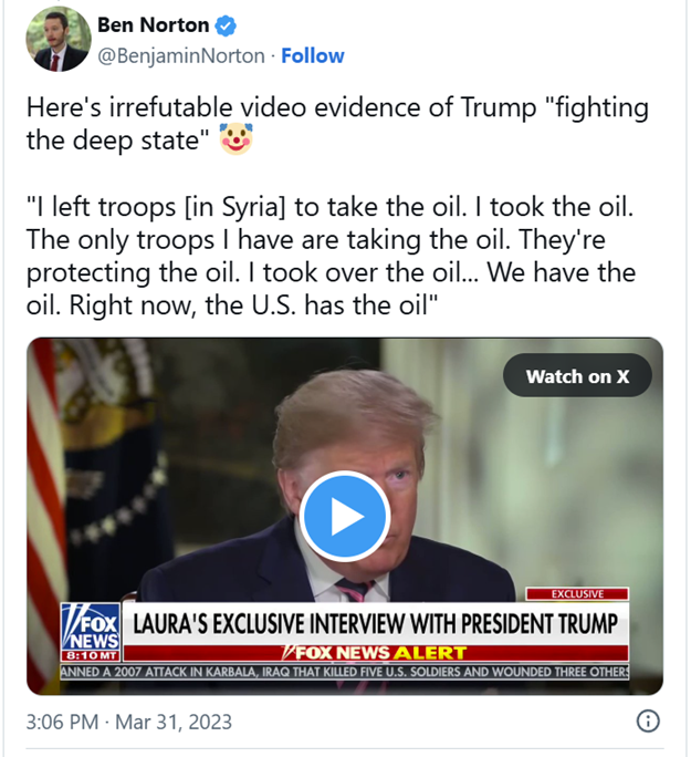 Ho lasciato le truppe per prendere il petrolio. Ho preso il petrolio. Le uniche truppe che ho stanno prendendo il petrolio. Stanno proteggendo il petrolio. Ho preso il controllo del petrolio… Abbiamo il petrolio. In questo momento, gli Stati Uniti hanno il petrolio.