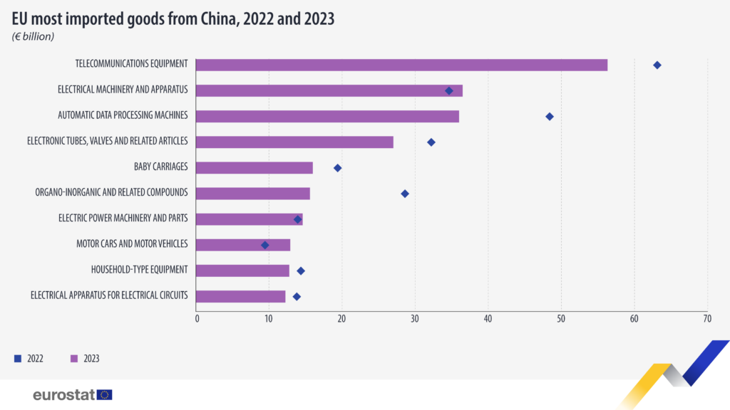 Nel frattempo, l’industria europea dipende sempre di più dai beni capitali cinesi. Secondo Eurostat, “Quando si tratta dei prodotti più importati dalla Cina, le apparecchiature per le telecomunicazioni sono state le prime, sebbene siano scese da 63,1 miliardi di euro (65,6 miliardi di dollari USA) nel 2022 a 56,3 miliardi di euro nel 2023. I macchinari e gli apparati elettrici (36,5 miliardi di euro) e le macchine automatiche per l’elaborazione dei dati (36 miliardi di euro) sono stati rispettivamente il secondo e il terzo bene più importato”. Le automobili e altri beni di consumo costituiscono una piccola parte delle importazioni UE dalla Cina e l’attenzione politica data al settore automobilistico è inversamente proporzionale al suo peso economico. Paradossalmente, dopo anni di pressioni americane sui governi europei per escludere l’infrastruttura di telecomunicazioni cinese, è diventata la magiore importazione europea dalla Cina.