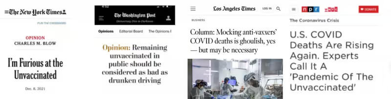La demonizzazione dei non conformi è stata sistematica e sconfinava in un territorio che sarebbe considerato incitamento all’odio se fosse stato rivolto a qualsiasi altro gruppo. I principali organi di informazione hanno fatto a gara per esprimere la condanna più velenosa dei non vaccinati. Il New York Times ha pubblicato titoli come “Sono furioso per i non vaccinati”, mentre il Washington Post ha dichiarato che “essere dei non vaccinati in pubblico dovrebbe essere considerato grave quanto guidare in stato di ubriachezza”.