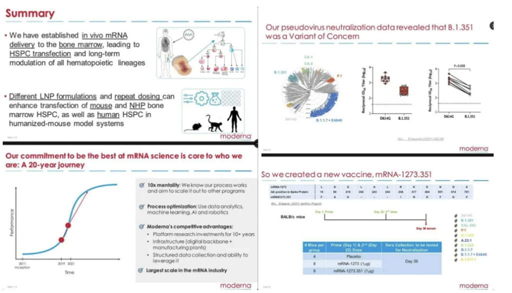 Mentre il CDC e i funzionari della sanità pubblica continuavano a rassicurare il pubblico che l’mRNA rimaneva isolato nel sito di iniezione, il discorso di Moderna a Wall Street raccontava una storia molto diversa. In una presentazione agli investitori (in seguito rimossa dal loro sito web ma archiviata tramite Wayback Machine), Moderna si vantava apertamente della capacità della sua tecnologia di fornire mRNA al midollo osseo, portando alla “trasfezione di HSPC e alla modulazione a lungo termine di tutti i lignaggi ematopoietici”. Le loro diapositive mostravano con orgoglio come diverse formulazioni di LNP (nanoparticelle lipidiche) e il dosaggio ripetuto potessero “migliorare la trasfezione” in vari sistemi, tra cui midollo osseo e HSPC umane (cellule staminali e progenitrici ematopoietiche) in “sistemi modello di topi umanizzati”.