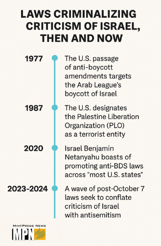 Nel febbraio 2020, il leader israeliano e criminale di guerra e ricercato internazionale Benjamin Netanyahu ha orgogliosamente dichiarato che Tel Aviv aveva “promosso leggi nella maggior parte degli stati degli Stati Uniti” per punire coloro che boicottano Israele, offrendo un rara visione delle forze straniere che erodono la libertà di parola nel cuore degli Stati Uniti.