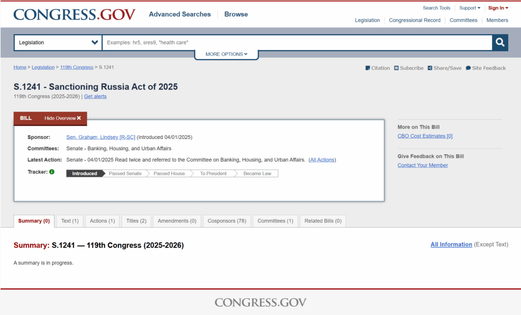 Il disegno di legge S.1241 – Sanctioning Russia Act of 2025 senatore Graham, Lindsey [R-SC]