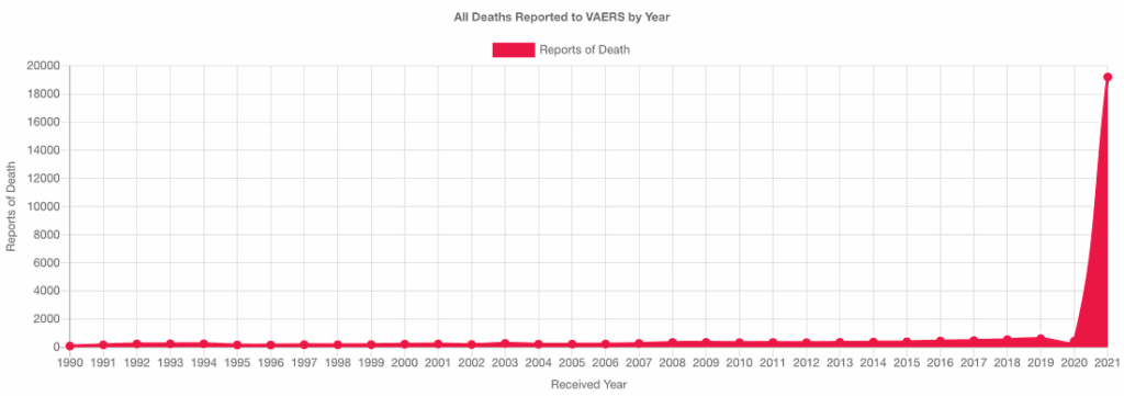 Questi sono dati ufficiali, decessi attribuibili al vaccino. Viene segnalata solo una percentuale molto piccola di decessi dovuti al vaccino. Tuttavia, il grafico sottostante indica oltre 19.000 decessi correlati al vaccino nel 2021 negli Stati Uniti.