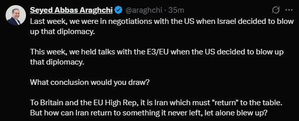 Traduzione: La settimana scorsa eravamo in trattativa con gli Stati Uniti quando Israele ha deciso di far saltare la diplomazia. Questa settimana, abbiamo avuto colloqui con l’E3/EU quando gli Stati Uniti hanno deciso di far saltare la diplomazia. Voi quale conclusione trarreste? Per la Gran Bretagna e l’Alto rappresentante dell’UE, è l’Iran che deve “tornare” al tavolo delle trattative. Ma come può l’Iran tornare a qualcosa che non ha mai lasciato, e tanto meno fatto saltare?