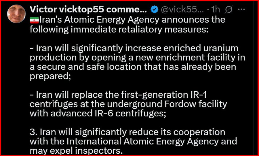 • Victor viktop55 comme… L’Agenzia iraniana per l’energia atomica annuncia le seguenti misure di ritorsione immediate: