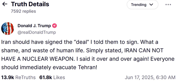 Traduzione: L’Iran avrebbe dovuto firmare l'”accordo” che gli avevodetto di firmare. Che peccato e che spreco di vite umane. In poche parole, l’IRAN NON PUÒ AVERE UN’ARMA NUCLEARE. L’ho detto e ridetto! Tutti dovrebbero evacuare immediatamente Teheran!