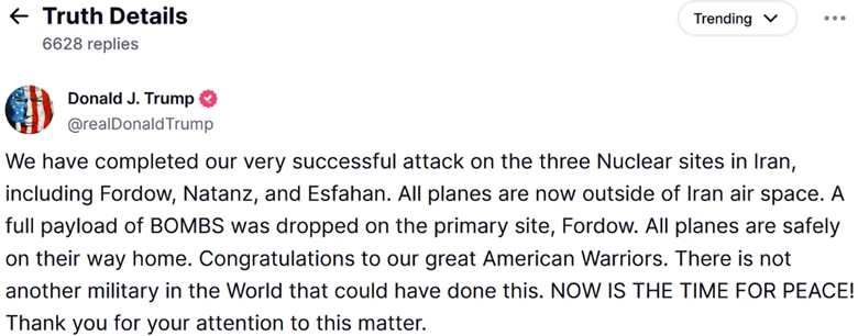 Traduzione. Abbiamo completato con successo il nostro attacco ai tre siti nucleari in Iran, tra cui Fordow, Natanz ed Esfahan. Tutti gli aerei sono ora fuori dallo spazio aereo iraniano. Un carico completo di bombe è stato sganciato sul sito principale, Fordow. Tutti gli aerei sono tranquillamente in viaggio verso casa. Congratulazioni ai nostri grandi guerrieri americani. Non c’è un altro esercito al mondo che avrebbe potuto fare questo. ORA È IL MOMENTO DELLA PACE! Grazie per la vostra attenzione a questo fatto