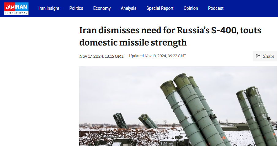 Secondo questa fonte, una pubblicazione anti-regime con sede nel Regno Unito e in Arabia Saudita, “I nostri sistemi attuali offrono capacità di gran lunga superiori rispetto all’S-400″, ha affermato Davood Sheikhian, vice responsabile delle operazioni della Forza aerospaziale dell’IRGC, in un’intervista video condivisa dai media controllati dallo Stato. Ha aggiunto che l’Iran sta anche utilizzando attivamente il sistema S-300 di fabbricazione russa e non vede alcuna necessità dell’S-400”. Ciò è stato affermato sette mesi prima che Israele e Stati Uniti lanciassero la loro guerra.