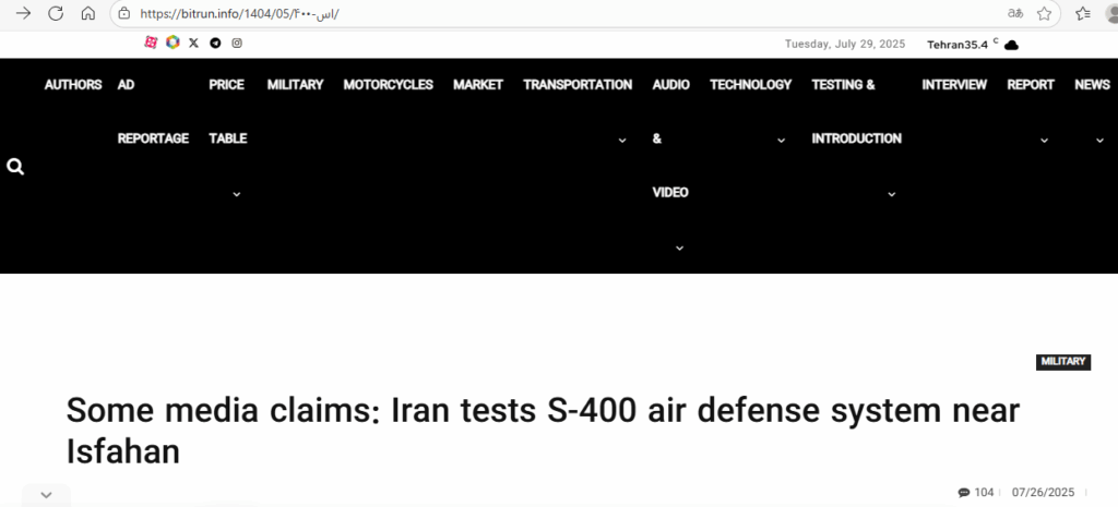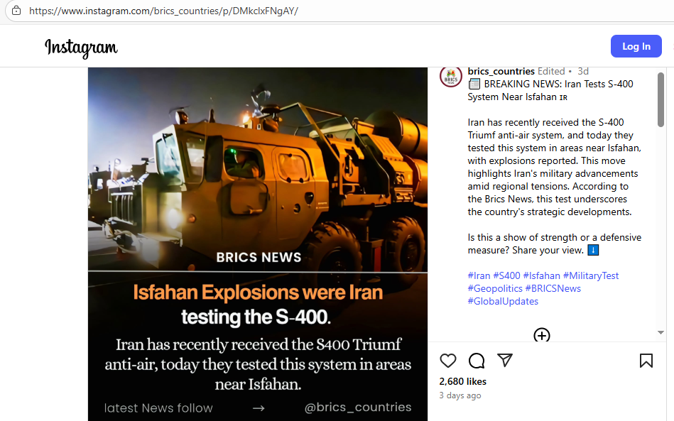 Il rapporto originale di bitrun.info afferma che “secondo un rapporto pubblicato da BRICS News, l’Iran ha recentemente ricevuto l’avanzato sistema di difesa aerea S-400 e oggi ha condotto il suo primo test operativo nelle aree intorno a Isfahan”. Il riferimento di BRICS News è una piattaforma Instagram che apparentemente pubblica materiale multimediale dei membri BRICS, incluso l’Iran. Questo rapporto originale è molto più breve della pubblicazione di bitrun.info.