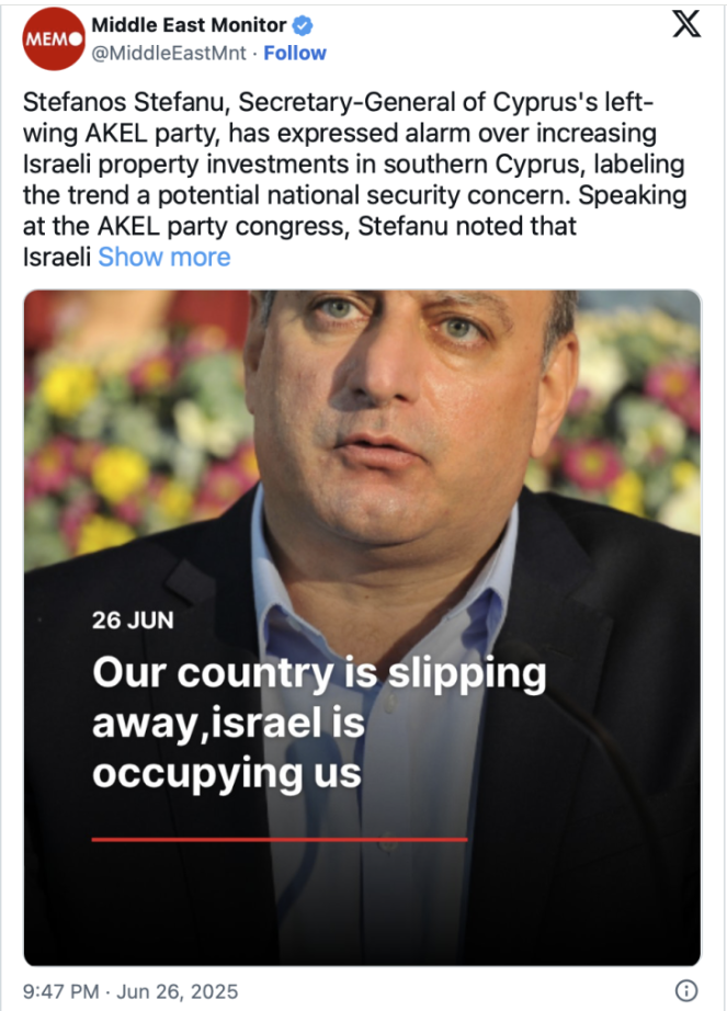 Il Jerusalem Post ha pubblicato “Gli ebrei comprano Cipro”: L’osservazione del leader di sinistra scatena una tempesta diplomatica“, che descrive quanto sta accadendo a Cipro come antisemitismo: