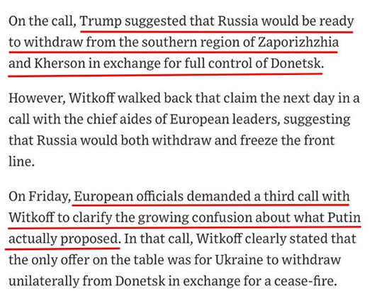 Traduzione: Durante la telefonata, Trump ha suggerito che la Russia sarebbe pronta a ritirarsi dalla regione meridionale di Zaporihzhia e Kherson in cambio del pieno controllo di Donetsk.Tuttavia, Witkoff ha ritrattato l’affermazione il giorno successivo in una telefonata con i principali assistenti dei leader europei, suggerendo che la Russia si sarebbe ritirata e avrebbe congelato la linea del fronte. Venerdì, i funzionari europei hanno richiesto una terza telefonata con Witkoff per chiarire la crescente confusione su ciò che Putin ha effettivamente proposto. Nella telefonata, Withkoff ha dichiarato chiaramente che l’unica offerta sul tavolo era il ritiro unilaterale dell’Ucraina da Donetsk in cambio di un cessate il fuoco.