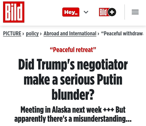 Ora BILD è arrivato addirittura ad accusare Witkoff di aver commesso un errore durante l’incontro con Putin, basando l’intero “vertice storico” su una totale incomprensione delle richieste del presidente russo: