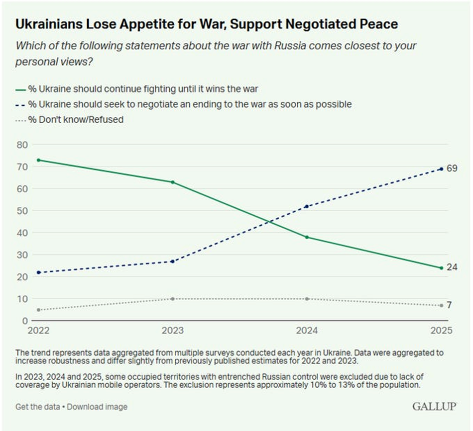 Nell’ultimo sondaggio Gallup sull’Ucraina , condotto all’inizio di luglio 2025, il 69% si dichiara favorevole a una fine negoziata della guerra il prima possibile, rispetto al 24% che sostiene di continuare a combattere fino alla vittoria.