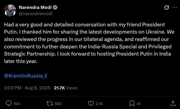 Traduzione: Ho avuto un’ottima e dettagliata conversazione con il mio amico PresidentePutin. L’ho ringraziato per aver condiviso gli ultimi sviluppi sull’Ucraina.Abbiamo anche esaminato i progressi della nostra agenda bilaterale e ribadito il nostro impegno ad approfondire ulteriormente il partenariato strategico speciale e privilegiato India-Russia. Sono ansioso di ospitare il Presidente Putin in India nel corso dell’anno.