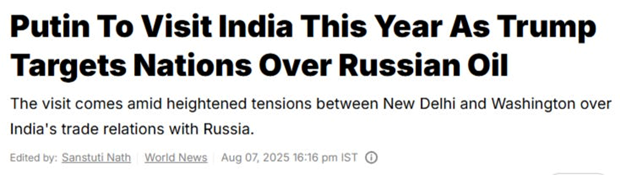 Secondo quanto riferito dal Consigliere per la Sicurezza Nazionale indiano Ajit Doval, Putin dovrebbe visitare l’India a fine agosto, per poi dirigersi a Pechino il 3 settembre. Queste visite erano il motivo originale per cui avevo dato per scontato che il vertice in Alaska fosse una scelta ovvia, dato che Putin sembra pronto per un lungo tour in quella parte del mondo e l’Alaska sarebbe una tappa obbligata.