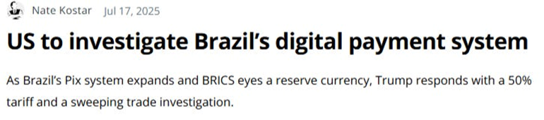 Bisogna tenere presente che il Brasile ha già creato diversi anni fa un proprio sistema di pagamento che bypassa lo SWIFT, chiamato PiX, e solo il mese scorso l’amministrazione Trump ha avviato un’indagine al riguardo, soprattutto perché PiX ha danneggiato gravemente gli affari di Visa e Mastercard.