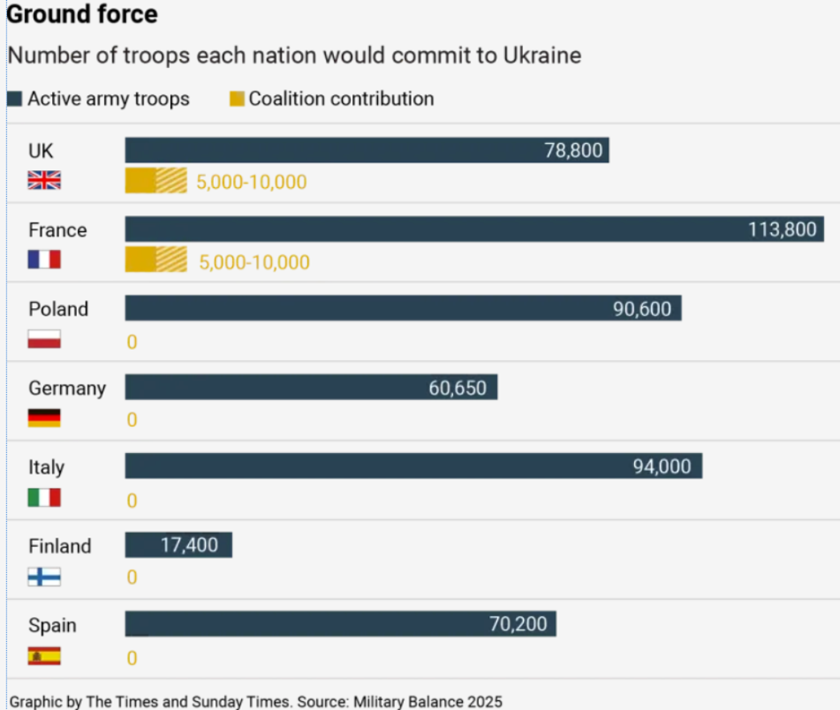 Il problema di questo scenario surreale รจ che non ci sono truppe, o quasi. Il tentativo capeggiato dalla Gran Bretagna di assemblare un esercito di volenterosi sembra essersi trasformato in un esercito di riluttanti. Solo il Regno Unito e la Francia hanno preso un potenziale impegno, tra i 5.000 e i 10.000 soldati ciascuno. Nessun altro Paese ha accettato.