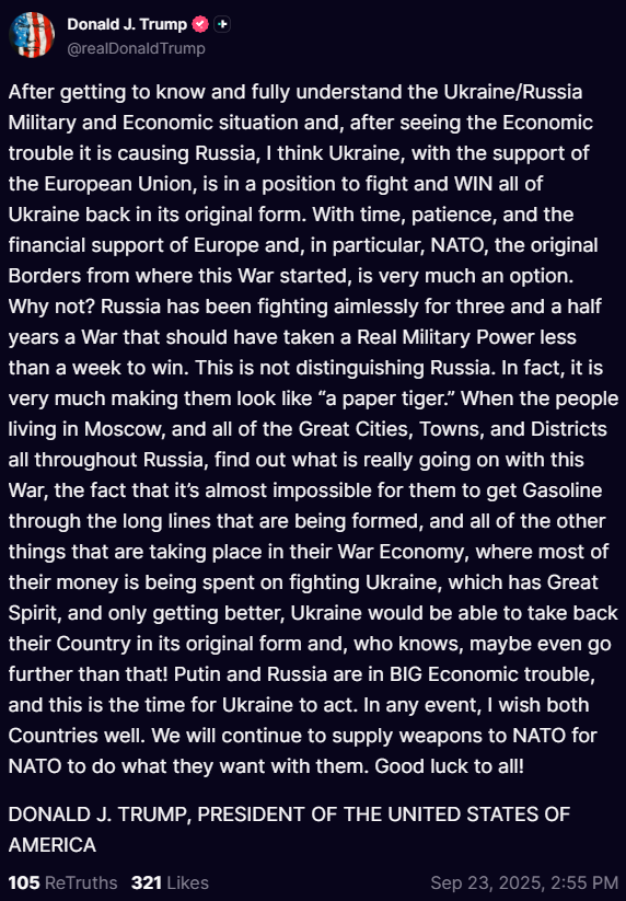 Traduzione: “Dopo aver conosciuto e compreso appieno la situazione militare ed economica dell’Ucraina e della Russia e dopo aver visto i problemi economici che sta causando alla Russia, penso che l’Ucraina, con il sostegno dell’Unione Europea, sia in grado di combattere e riconquistare tutta l’Ucraina nella sua forma originale. Col tempo, pazienza e il sostegno finanziario dell’Europa e, in particolare, della NATO, i confini originali da cui è iniziata questa guerra sono una possibilità concreta. Perché no? La Russia ha combattuto senza scopo per tre anni e mezzo una guerra che avrebbe richiesto meno di una settimana per essere vinta da una vera potenza militare. Questo non distingue la Russia. Anzi, la fa sembrare proprio una “tigre di carta”. Quando gli abitanti di Mosca e di tutte le grandi città, paesi e distretti della Russia scopriranno cosa sta realmente accadendo con questa guerra, il fatto che è quasi impossibile per loro procurarsi la benzina a causa delle lunghe code che si stanno formando e tutte le altre cose che stanno accadendo nella loro economia di guerra, dove la maggior parte del loro denaro viene speso per combattere l’Ucraina, che ha un grande spirito e sta solo migliorando, l’Ucraina sarebbe in grado di riprendersi il proprio Paese nella sua forma originale e, chissà, forse anche andare oltre! Putin e la Russia sono in GRANDI difficoltà economiche, e questo è il momento giusto per l’Ucraina per agire. In ogni caso, auguro ogni bene a entrambi i Paesi. Continueremo a fornire armi alla NATO affinché la NATO possa farne ciò che vuole. Buona fortuna a tutti!”