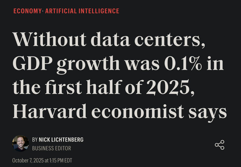 Il simbolo di questo gruppo è Nvidia, le cui azioni sono aumentate di oltre il 32% solo quest’anno. Google è in rialzo del 25% da inizio anno, mentre Meta è in rialzo del 17% da inizio anno, ma cosa sta guidando questi titoli e queste valutazioni? È al 100% il boom dell’intelligenza artificiale. Ma è qui che arriva lo shock: un professore di economia di Harvard ha recentemente rivelato che senza la costruzione di data center per l’intelligenza artificiale, la crescita del PIL negli Stati Uniti è cresciuta di un abissale 0,1% nella prima metà del 2025. L’intera economia statunitense è sostenuta dal settore dell’intelligenza artificiale ed è per questo che Trump e il governo degli Stati Uniti sono nel panico, perché senza il boom dell’intelligenza artificiale, l’economia statunitense sarebbe completamente distrutta.