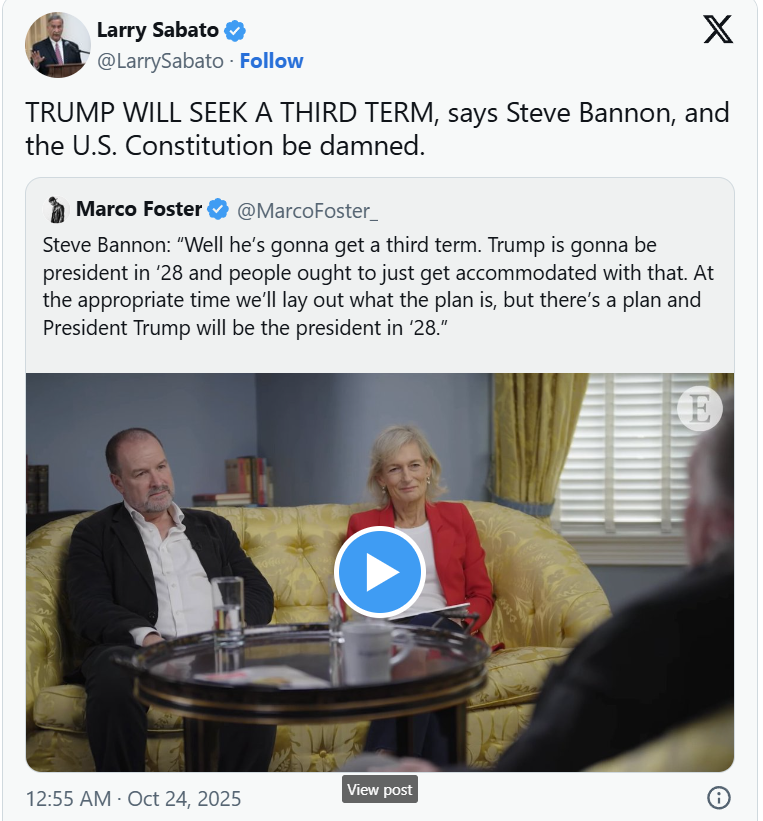 Interrogato sul 22° emendamento della Costituzione degli Stati Uniti, che vieta espressamente a un presidente di rimanere in carica per più di due mandati, Bannon ha affermato che “esistono molte alternative diverse” per aggirarlo.