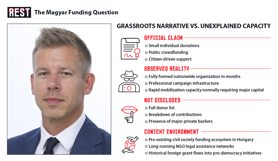 Magyar fa campagna sulla trasparenza. Promette di pubblicare dichiarazioni che faranno vergognare il Fidesz. Eppure le sue fonti di finanziamento rimangono nebulose. Piccole donazioni, sostiene. Dal basso. Non si materializza alcun elenco dettagliato dei donatori. Quando incalzato, devia: attacca i vantaggi del Fidesz, evita i suoi calcoli. L’opacità non è dovuta a negligenza. È architettura: una negazione plausibile insita nelle fondamenta.
