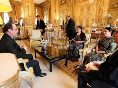 Ma gli Stati Uniti sostennero il PKK (ribattezzato YPG in Siria) durante la battaglia di Kobane. Fedele agli amici statunitensi, l’8 febbraio 2015 il presidente Hollande ricevette all’Eliseo Asya Abdullah, co-presidente dei curdi siriani (fedele ad Abdullah Ocalan), e la comandante Nesrin Abdullah in uniforme da combattimento. Salih Muslim, l’altro co-presidente dei curdi siriani e unico leader curdo favorevole al trasferimento dello Stato curdo in Siria, non fu invitato.