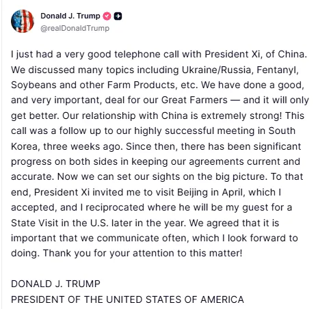 Traduzione: “Ho appena avuto un’ottima conversazione telefonica con il presidente cinese Xi. Abbiamo discusso di molti argomenti, tra cui Ucraina/Russia, fentanil, soia e altri prodotti agricoli, ecc. Abbiamo concluso un accordo positivo e molto importante per i nostri grandi agricoltori, e le cose non potranno che migliorare. Il nostro rapporto con la Cina è estremamente solido! Questa telefonata è stata il seguito del nostro incontro di grande successo in Corea del Sud, tre settimane fa. Da allora, ci sono stati progressi significativi da entrambe le parti nel mantenere i nostri accordi attuali e accurati. Ora possiamo concentrarci sul quadro generale. A tal fine, il presidente Xi mi ha invitato a visitare Pechino ad aprile, invito che ho accettato, e ho ricambiato invitandolo a sua volta per una visita di Stato negli Stati Uniti nel corso dell’anno. Abbiamo convenuto sull’importanza di comunicare spesso, cosa che non vedo l’ora di fare. Grazie per l’attenzione dedicata a questa questione!”