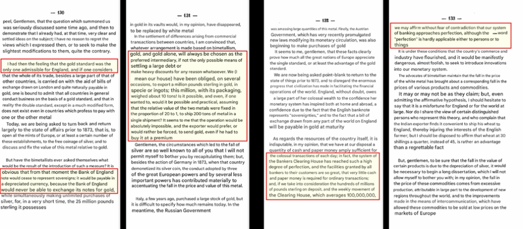 Sono fermamente contrario a un cambiamento radicale nella situazione monetaria della Gran Bretagna. In primo luogo, credo che il progresso della civiltà tenda a diminuire la necessità di grandi quantità di denaro contante, invece di aumentarla, e cosa potrebbe dimostrarlo meglio dell’esistenza e dell’ammirevole funzionamento della nostra Camera di Compensazione Bancaria? Questa istituzione movimenta in media cento milioni di sterline a settimana senza l’intermediazione di denaro contante o persino di banconote.