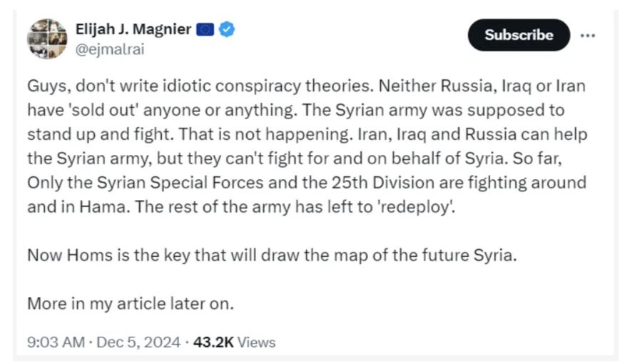 Ragazzi, non scrivete teorie cospirative idiote. Né la Russia, né l’Iraq, né l’Iran hanno “tradito” nessuno o qualcosa. L’esercito siriano avrebbe dovuto alzarsi e combattere. E questo non sta accadendo. Iran, Iraq e Russia possono aiutare l’esercito siriano, ma non possono combattere per conto della Siria. Finora, solo le forze speciali siriane e la 25a divisione stanno combattendo intorno e ad Hama. Il resto dell’esercito si è mosso per “ridistribuirsi”. Ora Homs è la chiave che disegnerà la mappa della futura Siria. Elijah J. Magnier @ejmalrai