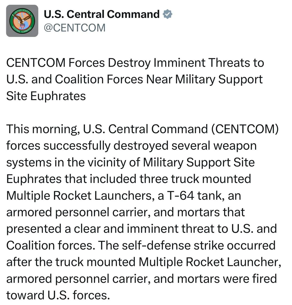 Il Comando Centrale degli Stati Uniti ha confermato il supporto aereo fornito in precedenza alle forze SDF nei villaggi sulla riva sinistra dell’Eufrate, vicino a Deir ez-Zor. Durante gli attacchi aerei, tre MLRS, un carro armato [per qualche motivo elencato come T-64, che la Siria non ha], un veicolo blindato per il trasporto di truppe e diversi mortai sono stati distrutti. Secondo il comando, gli attacchi sarebbero stati effettuati dopo che le forze americane erano state colpite con queste armi. Informatore militare