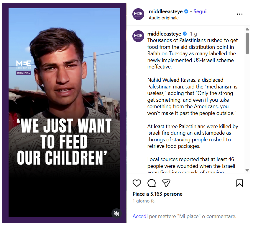Le organizzazioni umanitarie hanno criticato l’ubicazione dei siti, affermando che la fondazione viola i principi umanitari concentrandoli in un’unica area, rendendoli inaccessibili agli altri abitanti dell’enclave. Secondo la GHF, ogni scatola distribuita è destinata a sfamare esattamente 5,5 persone e durare 3,5 giorni. Ma diversi palestinesi hanno raccontato a Middle East Eye che, dopo aver ricevuto la scatola di aiuti, hanno scoperto che le forniture erano tristemente inadeguate.